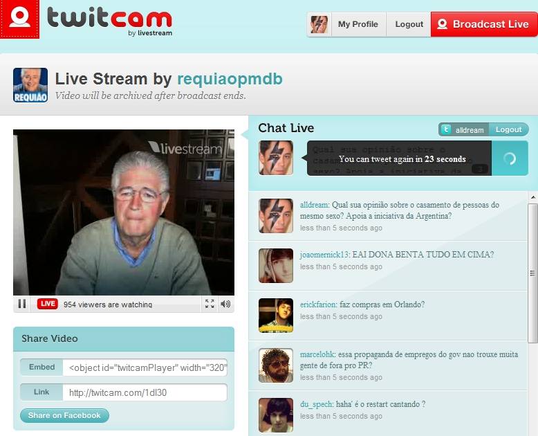 Na tentativa (bem-sucedida) de fazer do Twitter seu palanque eleitoral (for free and no strings attached), Requião ligou na noite de quarta-feira (28) sua webcam. Ao vivo, o político tirou dúvidas, conversou, riu e “animou” um possível eleitorado que pode ser conquistado pela rede social. Super djóvein!