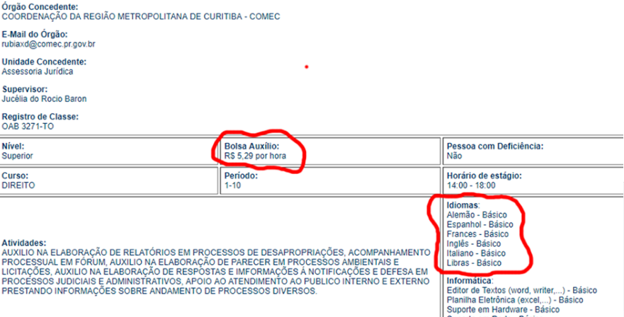 “A Comec (Coordenação da Região Metropolitana de Curitiba) pede desculpas pelo erro cometido na publicação deste anúncio de estágio. Não é exigido o conhecimento de línguas estrangeiras para nenhuma das vagas de estágio da Comec”, diz a nota.