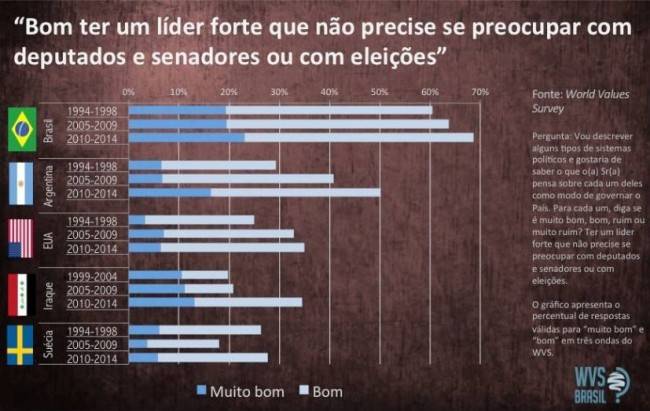 Numa comparação com outros países incluídos na World Values Survey fica evidente que os brasileiros estão entre os que mais desejam este “líder forte”. Nos Estados Unidos, as respostas somaram 35%. No Iraque as respostas também ficaram no mesmo patamar.