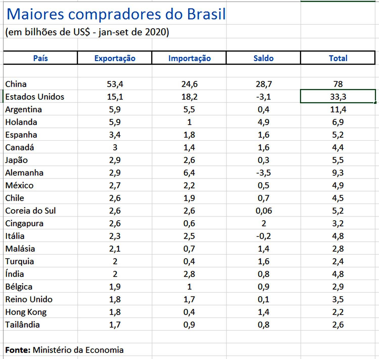Com os EUA, pelo contrário, a situação piorou para o lado brasileiro. De janeiro a setembro deste ano o Brasil conseguiu vender apenas R$ 15,1 bilhões para os norte-americanos. Em contrapartida, os ‘gringos’ venderam para os brasileiros R$ 18,2 bilhões, o que resultou em saldo negativo para o Brasil de mais de US$ 3 bilhões. O volume de negócios entre os dois países despencou: foram US$ 33,3 bilhões em transações comerciais nos nove primeiros meses deste ano contra US$ 44,7 bilhões no mesmo período de 2019 – uma queda de mais de US$ 11 bilhões (cerca de 25%).