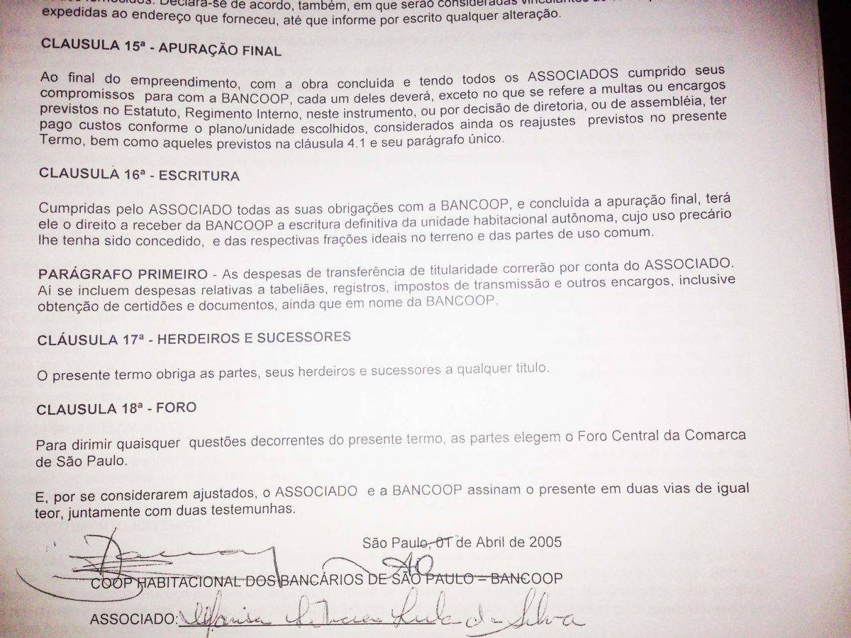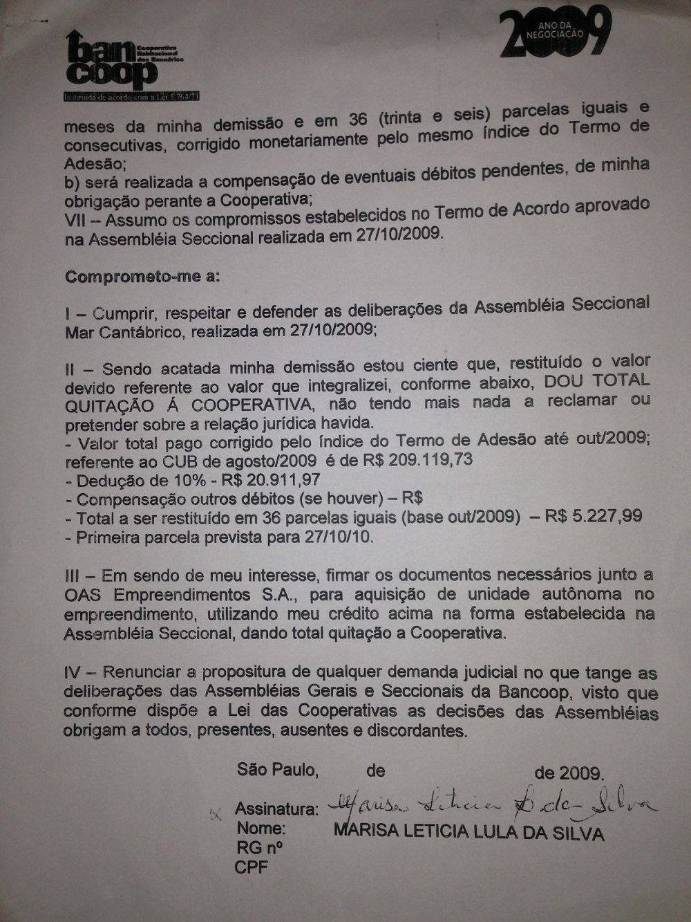 Marisa Letícia Lula da Silva assina o “Termo de Adesão e Compromisso de Participação” com a Bancoop – Habitacional dos Bancários de São Paulo.