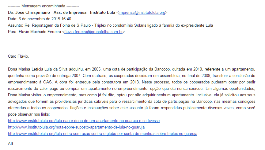 Durante esse período, além de esclarecer que Marisa Letícia era dona apenas de uma cota da Bancoop, a Assessoria de Imprensa do Instituto Lula sempre informou aos jornalistas que a família estava avaliando se iria ou não comprar o imóvel.