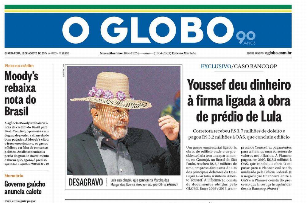 As falsas notícias chegam ao auge em 12 de agosto de 2015, quando O Globo, mesmo corretamente informado pela Assessoria do Instituto Lula, insiste em atribuir ao ex-presidente a propriedade do apartamento. Em evidente má-fé sensacionalista, O Globochamou o prédio de Edifício Lula na primeira página de 13 de agosto.