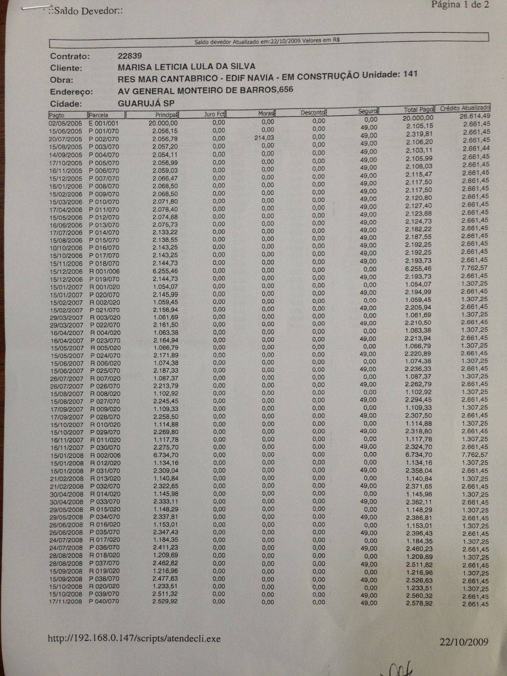 Marisa Letícia paga a entrada de R$ 20 mil, as prestações mensais e intermediárias do carnê da Bancoop, até setembro de 2009. Naquela altura, a Bancoop passava por uma crise financeira e estava transferindo vários de seus projetos a empresas incorporadoras, entre as quais, a OAS.