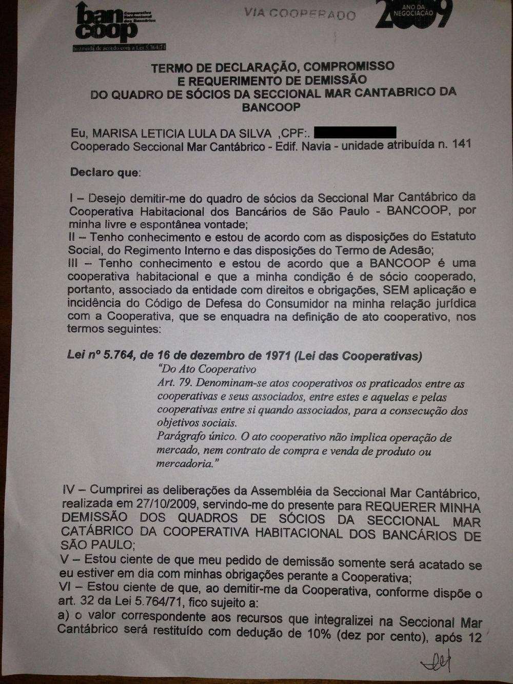 Marisa Letícia Lula da Silva assina o “Termo de Declaração, Compromisso e Requerimento de Demissão do Quadro de Sócios da Seccional Mar Cantábrico da Bancoop”.