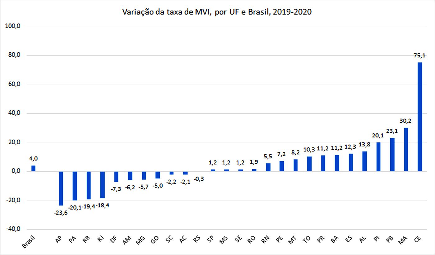 A alta é um retrocesso na luta contra a violência, considerando que nos dois últimos anos o país sinalizava melhora. Em 2017, o Brasil atingiu um recorde de assassinatos e a taxa chegou a 30,9 mortes para cada 100 mil habitantes. O índice caiu em 2018 e 2019, quando recuou para 22,7 por 100 mil habitantes. No ano passado a taxa pulou para 23,6 por 100 mil.