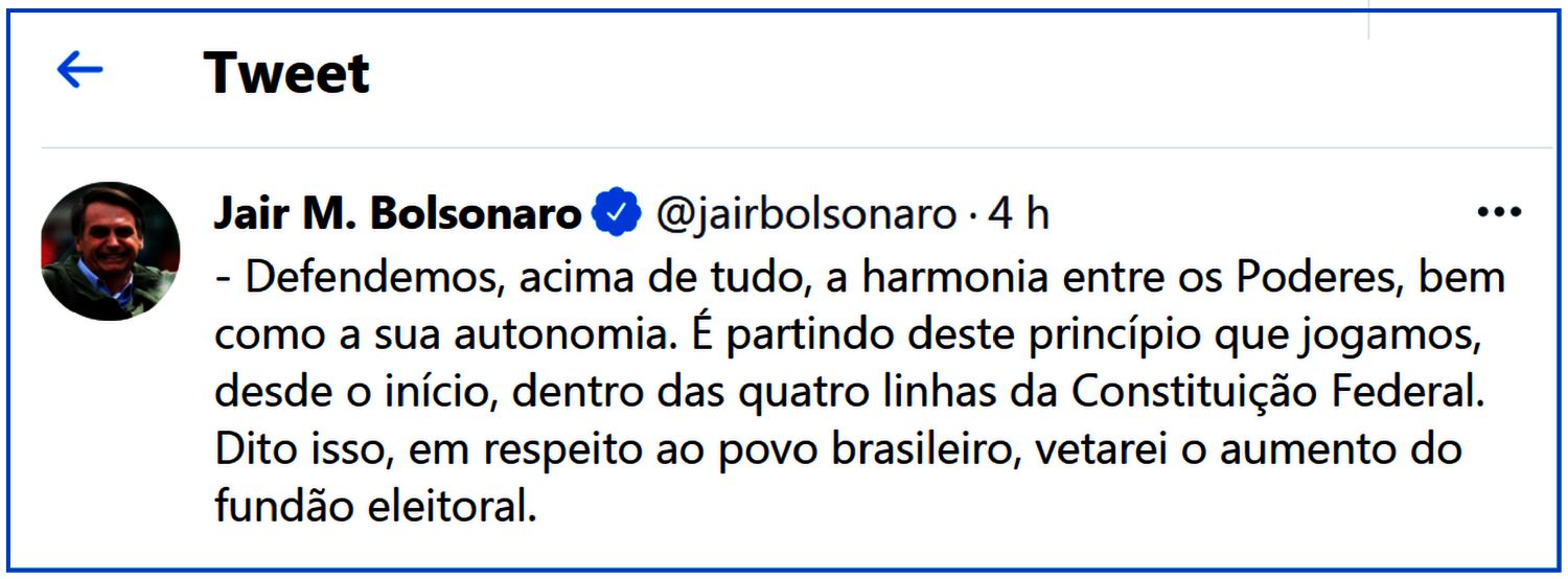 O presidente Jair Bolsonaro, depois de declarações dúbias nos últimos dias, deu uma declaração em tom ‘oficial’ nesta terça-feira (20) de que irá vetar os R$ 5,7 bilhões. A dúvida é se ele vai contrariar o centrão e, inclusive, seus filhos, o senador Flávio Bolsonaro e o deputado Eduardo Bolsonaro, que votaram a favor do aumento.