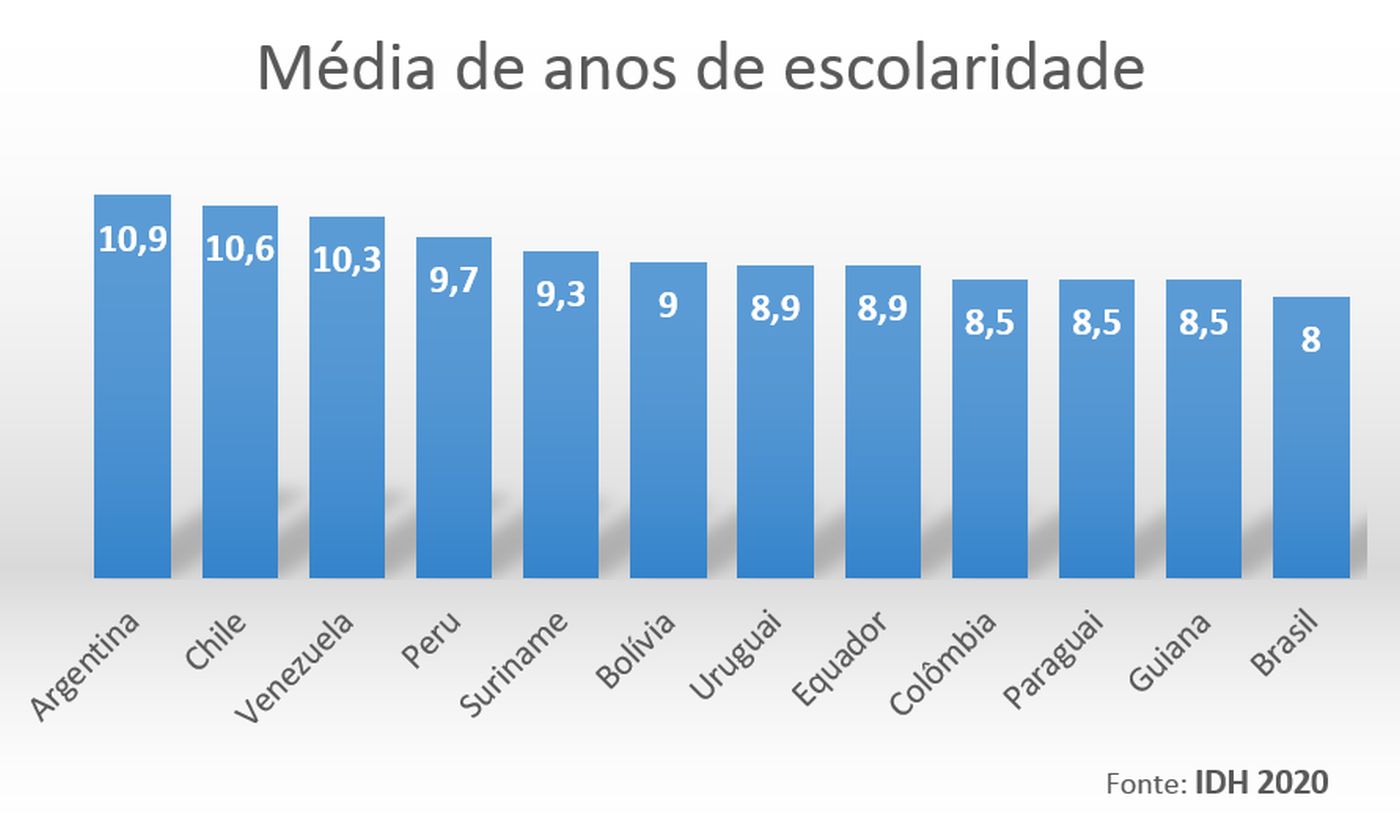 Um dos indicadores que puxam o Brasil para trás no ranking de desenvolvimento humano (IDH) é a educação. Estagnado desde 2016 em expectativa de anos de escolaridade (15,4 anos), o país conseguiu melhorar um pouco a média de anos de permanência na escola, de 7,8 anos em 2018 para 8 anos em 2019, mas amarga a última colocação entre os países sul-americanos.
