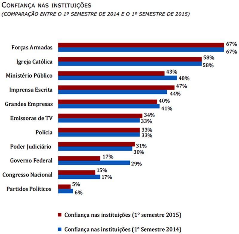 A maior queda de confiabilidade, contudo, é do Governo Federal, de 29% para 17%. O recuo de 12 pontos porcentuais é interpretado como reflexo dos escândalos de corrupção e da crise econômica por que passa o país.