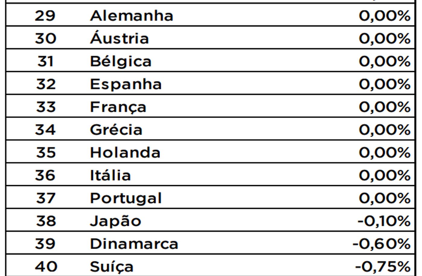 Quando a comparação é feita pelas taxas nominais de juro, a situação do Brasil também é muito ruim. De acordo com o levantamento, em termos nominais, o Brasil fica na 3ª colocação, abaixo de Argentina e Turquia, mas acima de pares internacionais como Rússia, que cortou juros a 9,5%, Chile, México, Colômbia e Polônia.
