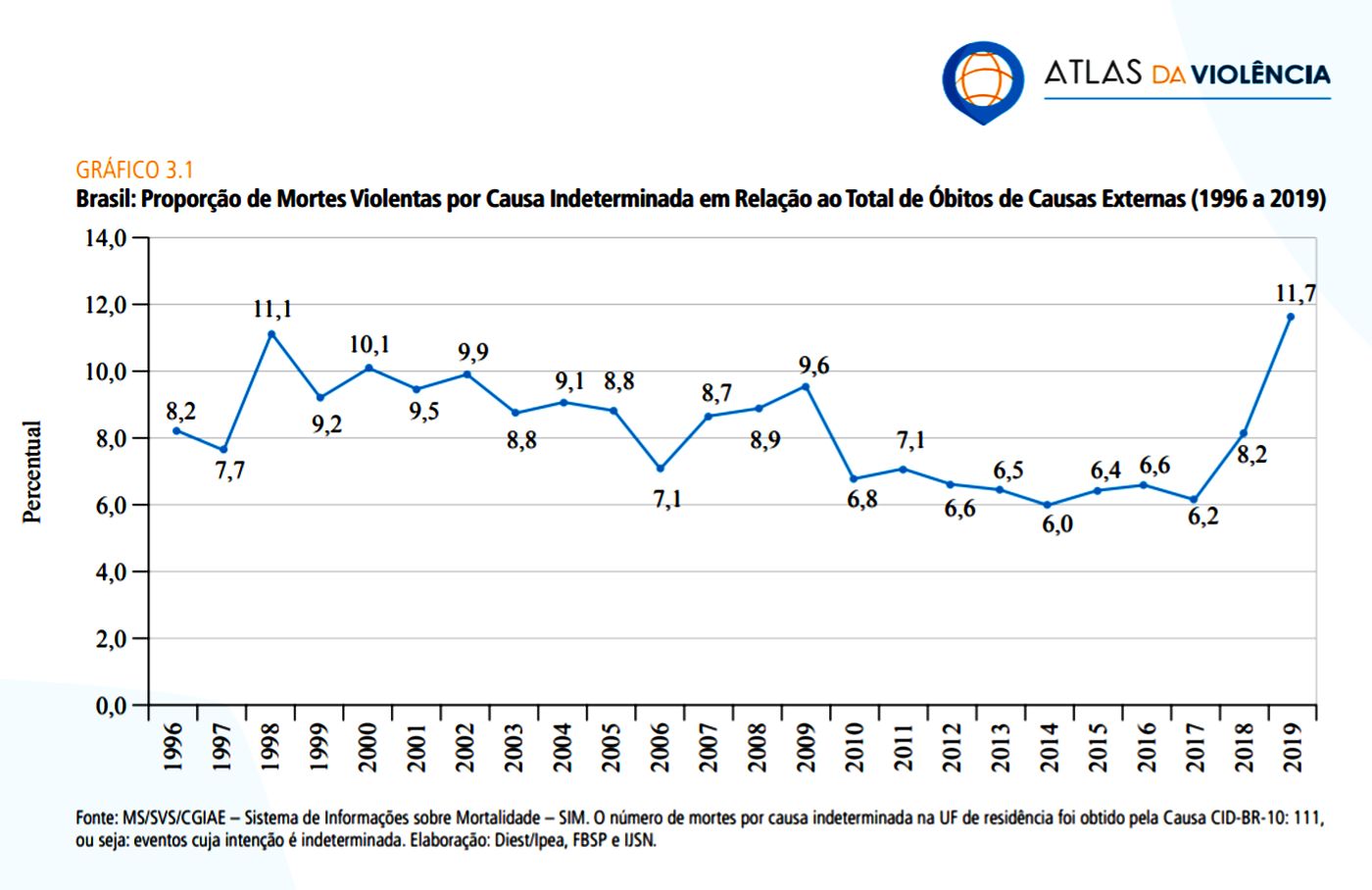 Segundo os pesquisadores do Atlas da Violência, “o recente aumento das mortes violentas por causa indeterminada (MVCI) no Sistema de Informações de Mortalidade reduz o conhecimento sobre a realidade atual” da violência no país.