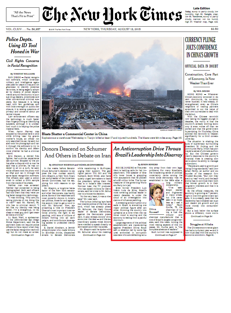Reprodução da capa do NYT com destaque para a crise no Brasil.Com o título “Esforço anticorrupção lança a liderança do Brasil em desordem”, a reportagem relata que dezenas de políticos e empresários são investigados sob suspeita de participação em esquema de irregularidades na Petrobras.