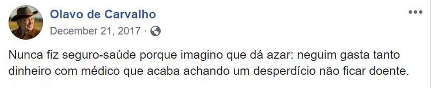 Em postagem de 2017 na internet, Olavo de Carvalho disse nunca ter feito seguro-saúde porque imaginava que daria azar. Nos EUA, sem seguro-saúde, alguns tratamentos com longas internações chegam a custar centenas de milhares de dólares e até milhões.