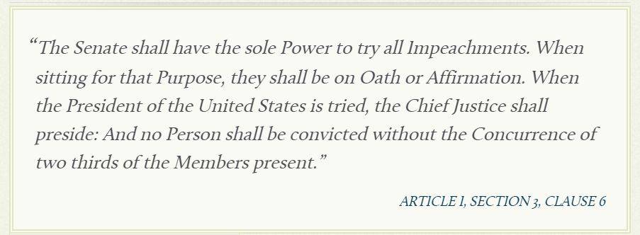 “Só o Senado poderá julgar os crimes de responsabilidade (impeachment). Reunidos para esse fim, os Senadores prestarão juramento ou compromisso. O julgamento do Presidente dos Estados Unidos será presidido pelo Presidente da Suprema Corte. E nenhuma pessoa será condenada a não ser pelo voto de dois terços dos membros presentes”, diz o texto da carta dos EUA. Veja a redação em inglês: