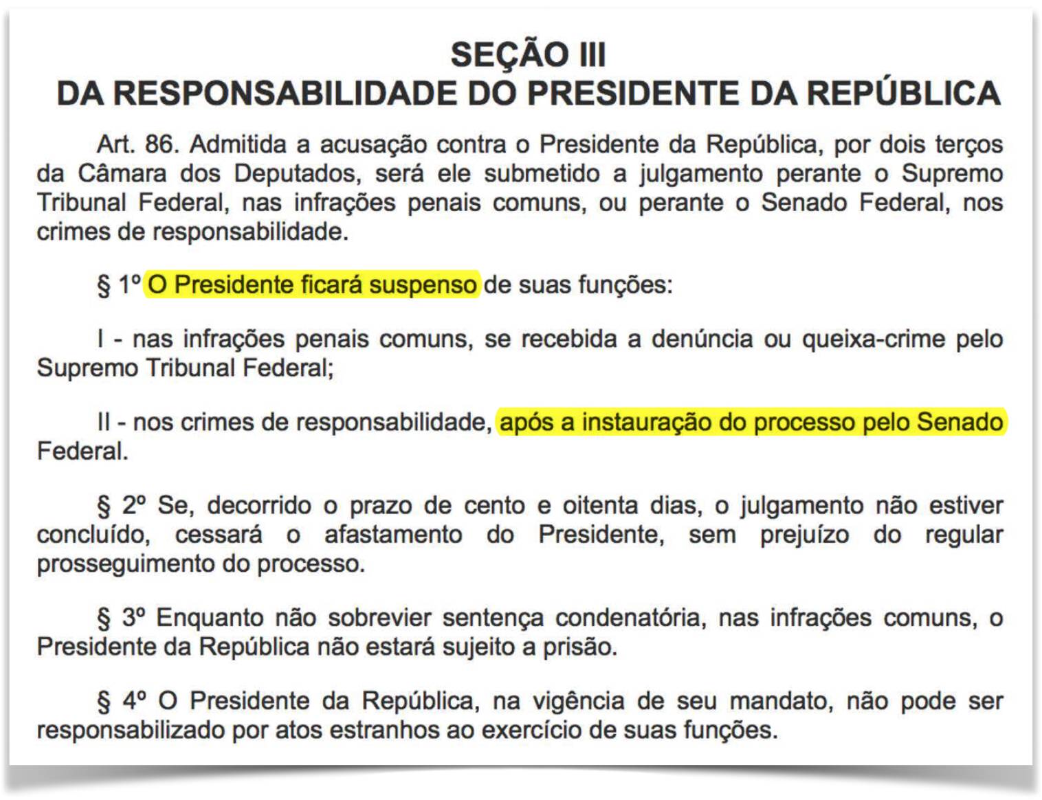 A chamada Constituição Cidadã, que enterrou o autoritarismo do regime militar, não deixa dúvida de que “o presidente ficará suspenso de suas funções, nos crimes de responsabilidade, após a instauração do processo pelo Senado Federal”. Veja o texto no original: