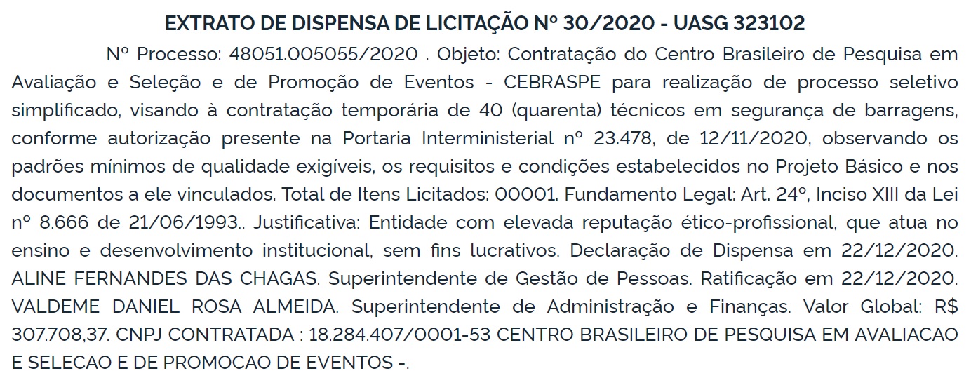 Está definida a organizadora do próximo processo seletivo da Agência Nacional de Mineração (ANM). De acordo com o extrato de dispensa de licitação publicado hoje (23/12) no DOU, o Centro Brasileiro de Pesquisa em Avaliação e Seleção e de Promoção de Eventos - CEBRASPE - ficará responsável pelas etapas da seleção que terá a oferta de 40 vagas para Técnico em Segurança de Barragens de Mineração, função que exige o nível superior específico, além de experiência na área ou o título de mestre ou doutor.