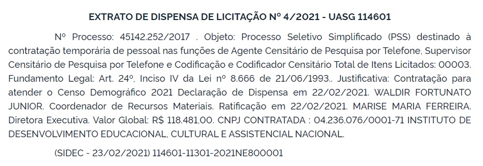 De acordo com a publicação do Diário Oficial da União, a organizadora da seleção será o Instituto de Desenvolvimento Educacional, Cultural e Assistencial Nacional (Idecan), escolhida por dispensa de licitação.