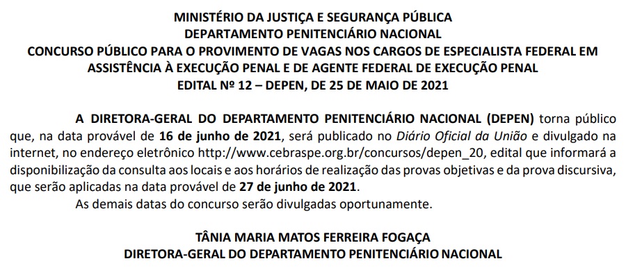 Está definida uma nova data para primeira fase do concurso do Departamento Penitenciário Nacional (DEPEN), seleção que já foi suspensa duas vezes (7 de agosto de 2020 e 24 de fevereiro de 2021) em razão do agravamento da pandemia causada pelo novo Coronavírus (Covid-19). O concurso teve início em 5 de maio de 2020 com a oferta de 309 vagas nos cargos de Especialista Federal em Assistência à Execução Penal (nível superior) e Agente Federal de Execução Penal (nível médio), além da formação de cadastro de reserva.