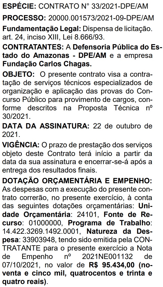 A instituição tem um concurso em andamento para a carreira de Defensor Público. Já o novo certame ficará na responsabilidade da Fundação Carlos Chagas e tem regulamento aprovado pelo Ato Normativo n.º 12/2021-GDPG/DPE/AM.