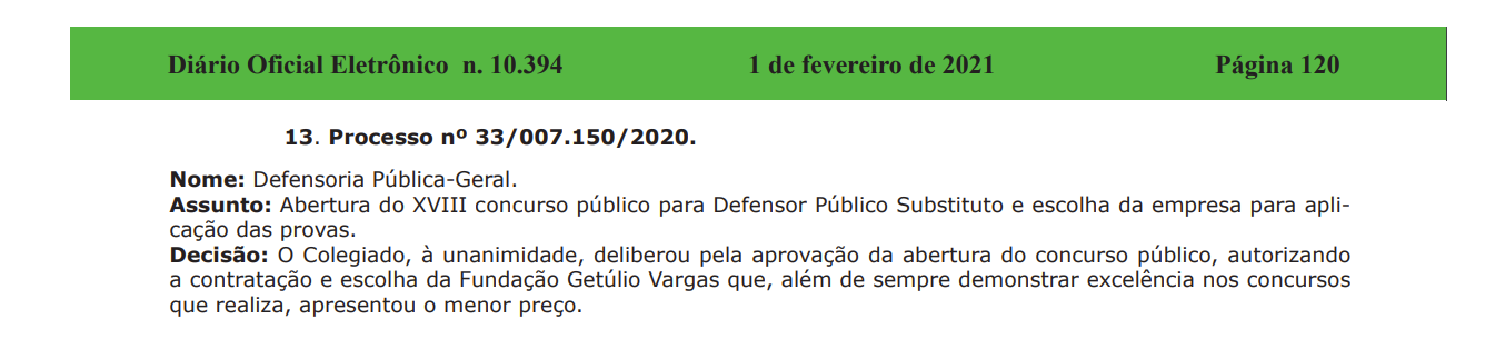 Uma excelente notícia para quem está se preparando para editais da área jurídica. Está definida a organizadora do XVIII Concurso para Defensor Público do Estado de Mato Grosso do Sul. Conforme publicação oficial desta segunda (1º), a instituição escolhida para organizar o certame foi a Fundação Getúlio Vargas (FGV).