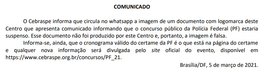 Nas últimas quarenta e oito horas circularam falsas notícias do cancelamento da prova da Polícia Federal em grupos de mensagens e redes sociais, gerando desconforto entre os candidatos. A situação foi esclarecida no início da noite desta sexta (05), quando o Cebraspe, organizadora do concurso, emitiu nota desmentindo a informação e confirmando que a prova acontecerá no próximo dia 21.