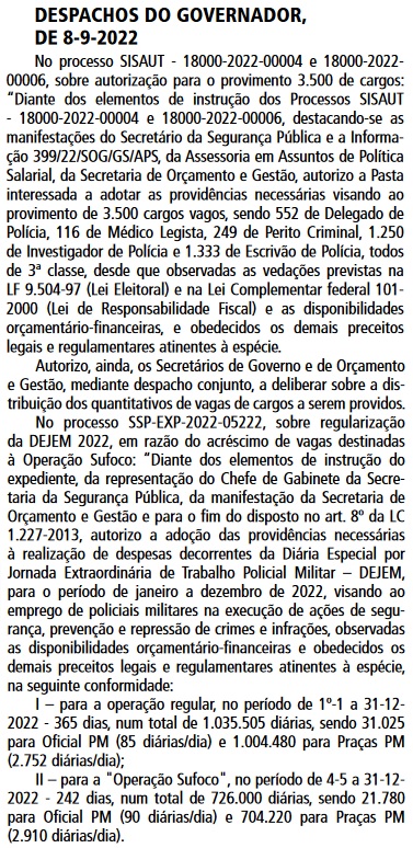 Conforme o despacho do governador publicado no DOE-SP, a Secretaria da Segurança Pública tem autorização para o provimento de 3.500 cargos vagos de delegado (552), escrivão (1.333), investigador (1.250), médico legista (116) e perito criminal (249).