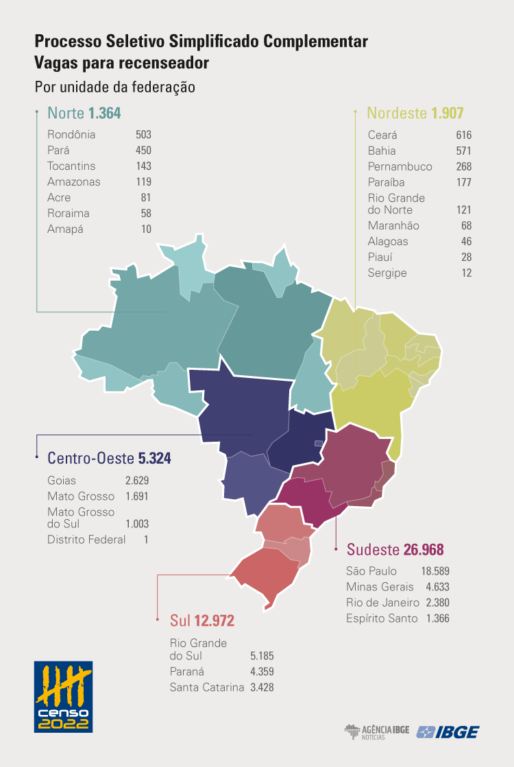 Estão abertas as inscrições do processo seletivo complementar da Fundação Instituto Brasileiro de Geografia e Estatística (IBGE), seleção que oferta 48.535 vagas para recenseador, função que exige apenas o ensino fundamental completo. De acordo com o edital de abertura (baixe aqui), os aprovados serão contratados por até três meses com lotação em todos os estados do país, podendo haver prorrogação com base na disponibilidade de recursos orçamentários e nas necessidades de conclusão das atividades do Censo Demográfico.