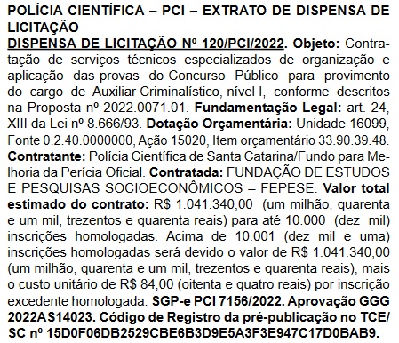 Segundo o extrato da dispensa de licitação n.º 120/2022 publicado no DOE-SC, a Fundação de Estudos e Pesquisas Socioeconômicos (FEPESE) será responsável pelo planejamento, administração e execução das provas do certame.