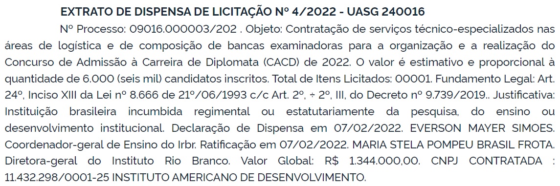 Já está escolhida a organizadora do próximo concurso para ingresso no cargo de terceiro-secretário da carreira de diplomata, função que exige nível superior em qualquer área de formação e que tem subsídio inicial de R$ 19.199,06. De acordo com o extrato de dispensa de licitação publicado no DOU, responsabilidade por todas as etapas do certame será do Instituto Americano de Desenvolvimento (IADES), mesma organizadora do último edital (2020).
