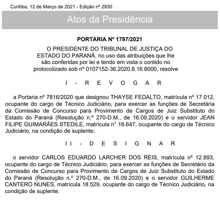 Nesta sexta-feira (12) foi publicada no Diário do Tribunal de Justiça do Paraná a portaria n.º 1.797/2021 que altera um dos membros da comissão organizadora do próximo concurso para juiz substituto. Conforme divulgamos aqui no blog, a última movimentação nos preparativos desta seleção aconteceu em 23 de outubro de 2020, quando o presidente da comissão apresentou uma série de alterações no regulamento do concurso numa sessão do Conselho da Magistratura.