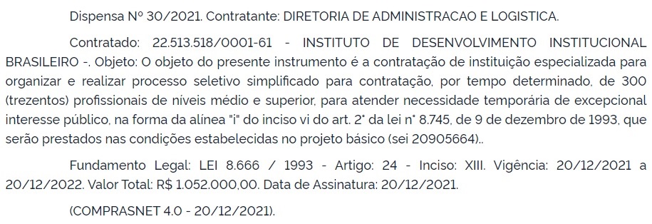 De acordo com o extrato de dispensa de licitação publicado no Diário Oficial da União desta terça (21), o Instituto de Desenvolvimento Institucional Brasileiro (IDIB) ficará responsável pela seleção, que terá o edital de abertura divulgado antes do dia 27 de fevereiro de 2022.