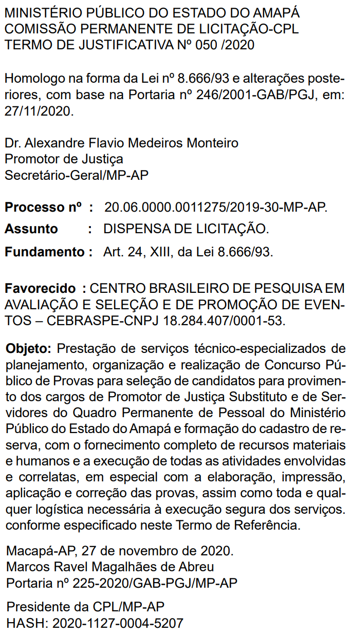 Está contratada a organizadora dos próximos concursos para promotor de justiça substituto e para servidores do quadro permanente de pessoal do Ministério Público do Amapá (MP-AP). De acordo com a publicação do DOE (abaixo), o Centro Brasileiro de Pesquisa em Avaliação e Seleção e de Promoção de Eventos (Cebraspe) será a instituição responsável pela realização de ambos os concursos.