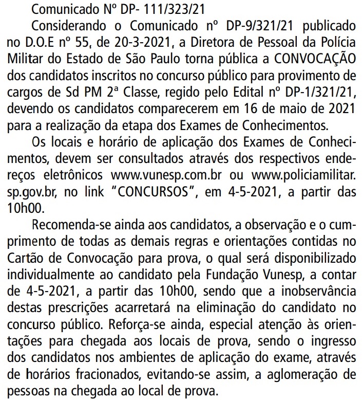 Nesta terça (27) foi publicado no Diário Oficial do estado de São Paulo o comunicado n.º 111/323/21 que definiu uma nova data para o exame de conhecimentos do concurso para soldado da Polícia Militar do estado de São Paulo (PM-SP). O edital foi suspenso em 22/03 devido ao avanço da pandemia causada pelo Covid-19. Como consequência, houve o cancelamento das provas escritas que aconteceriam em 11 de abril.
