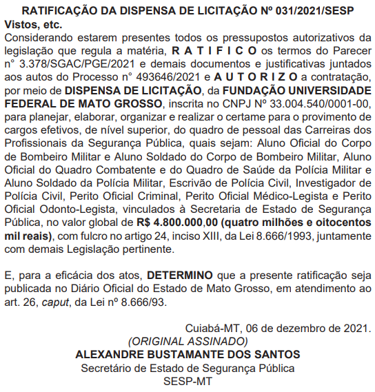 Conforme o documento publicado no DOE, a realização do concurso caberá a Universidade Federal de Mato Grosso (UFMT), entidade contratada através de dispensa de licitação.