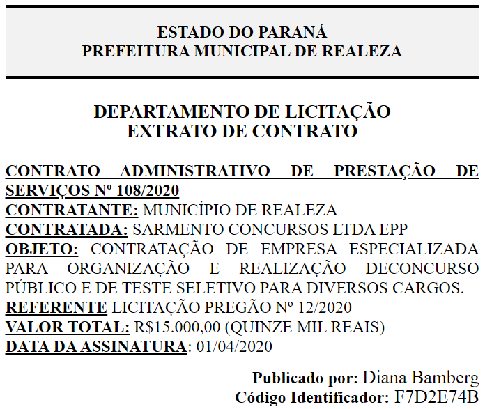 Conforme a publicação do Diário Oficial dos Municípios do Paraná, a empresa escolhida para organizar a seleção foi a MS Concursos (Sarmento Concursos Ltda. EPP). Com a definição da banca, a próxima etapa será a elaboração do edital de abertura do concurso, conforme as diretrizes definidas no contrato celebrado com a empresa vencedora.