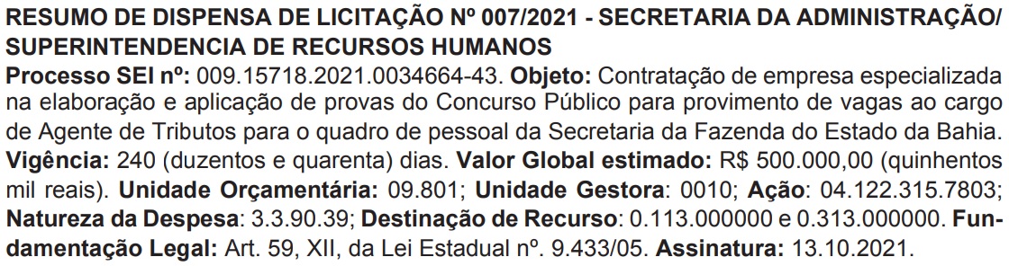O governo do estado da Bahia terá um novo concurso para Secretaria da Fazenda (SEFAZ-BA), com a oferta de 49 vagas para ingresso na carreira de agente de tributos estaduais. A Fundação Getúlio Vargas (FGV) será a organizadora responsável pelo concurso, escolhida pela Secretaria da Administração do Estado da Bahia com dispensa de licitação.