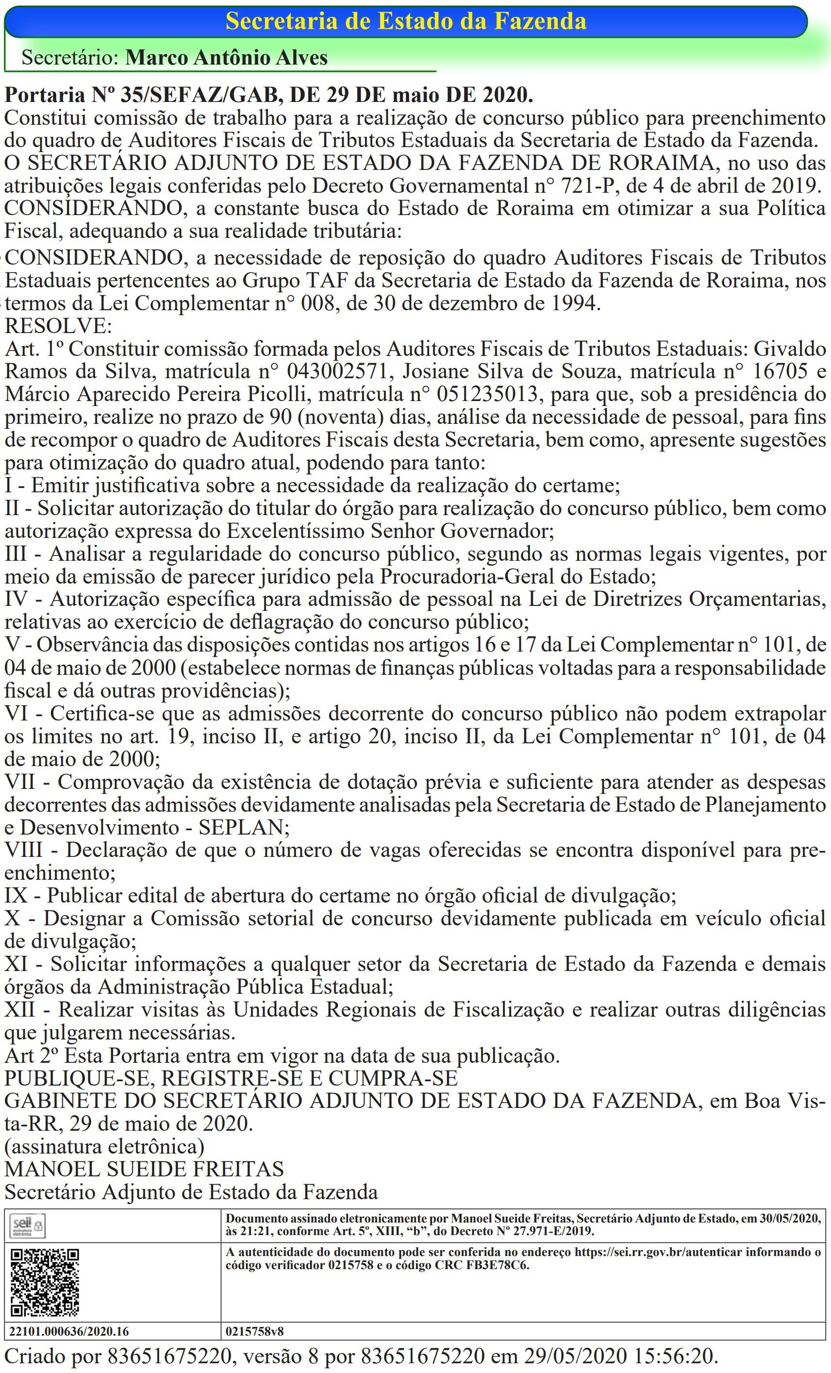 Uma excelente novidade para quem está se preparando para ingressar na carreira fiscal. A Secretaria de Estado da Fazenda de Roraima constituiu uma comissão de servidores responsável pela análise da necessidade de recompor o quadro de Auditores Fiscais da Secretaria, já que o último concurso para o cargo aconteceu há cerca de 14 anos. Segundo a portaria publicada no DOE de Roraima em 2 de junho de 2020 (imagem), a comissão terá noventa dias de prazo para definir a necessidade do concurso e iniciar os preparativos para a publicação do edital.