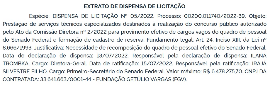 Uma excelente notícia para vem estudando para o próximo concurso para ingresso no quadro de servidores do Senado Federal. De acordo com o extrato de dispensa de licitação publicado no Diário Oficial da União desta segunda-feira (18), o órgão escolheu a Fundação Getúlio Vargas (FGV) para ser a organizadora responsável pelas provas do certame.