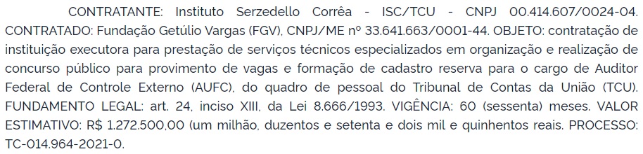 Está definida a organizadora do próximo concurso do Tribunal de Contas da União (TCU), edital que terá vinte vagas no cargo de Auditor Federal de Controle Externo (AUFC), função com inicial de R$ 21.947,82 e que exige nível superior em qualquer área de atuação.