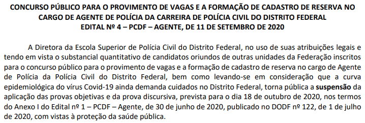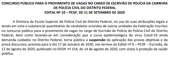 Mais dois editais estão suspensos devido a pandemia causada pelo novo Coronavírus (Covid-19). A Polícia Civil do Distrito Federal cancelou a aplicação das provas escritas para os cargos de agente e escrivão que aconteceriam em Brasília nos dias 17 e 18 de setembro de 2020 devido a curva epidemiológica do vírus Covid-19 que ainda demanda cuidados no Distrito Federal.