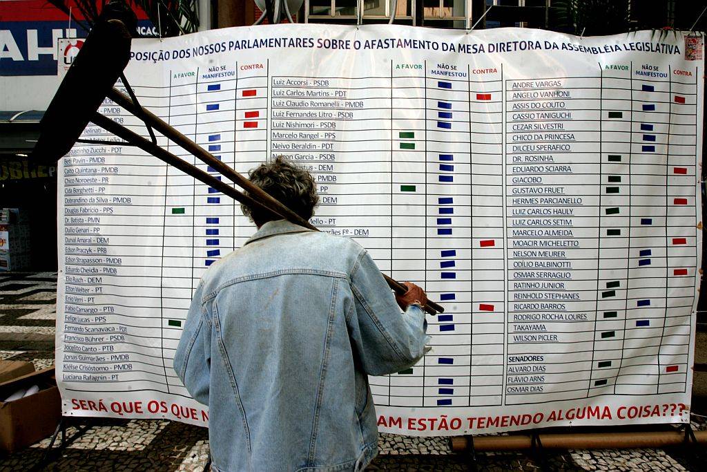 Morador de Londrina observa o painel, instalado no calçadão central, com a opinião dos parlamentares paranaenses sobre o afastamento da Mesa Diretora da Assembleia