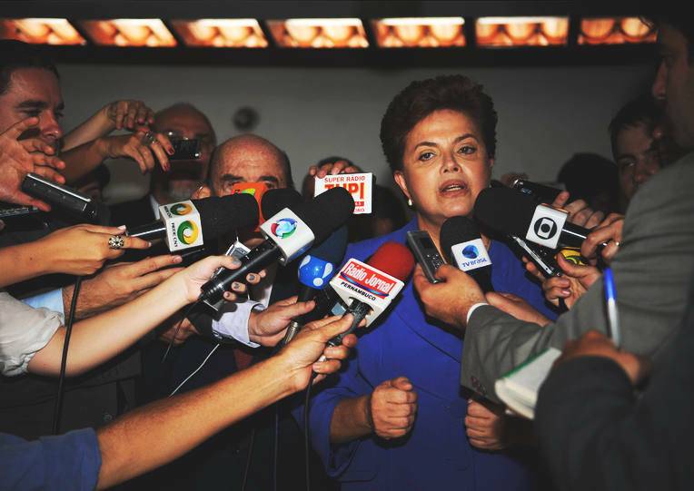 Dilma entre os repórteres: segundo turno com o punho cerrado.
