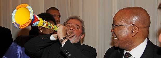 Presidente Lula toca vuvuzela em encontro com o presidente da África do Sul, Jacob Zuma. Fora do continente, é mais fácil.