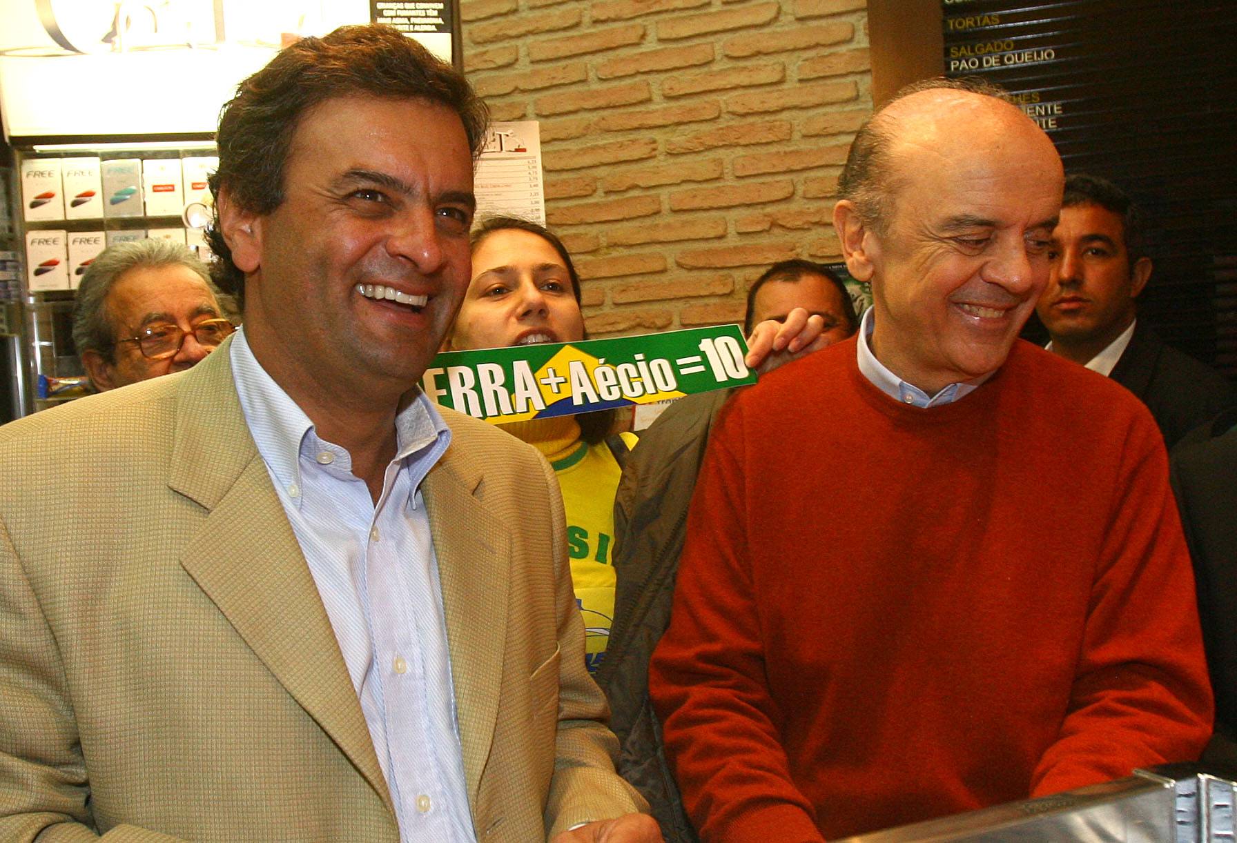 Aécio, o adesivo e Serra, em Curitiba: o mineiro segue vivo na briga presidencial.