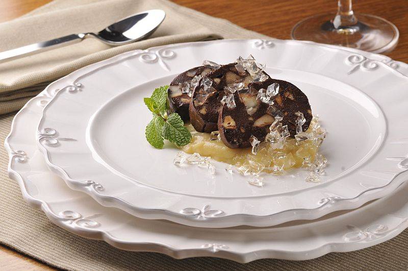 Roulade de chocolate com castanhas do Brasil, compota de cupuaçu e gelatina de cachaça