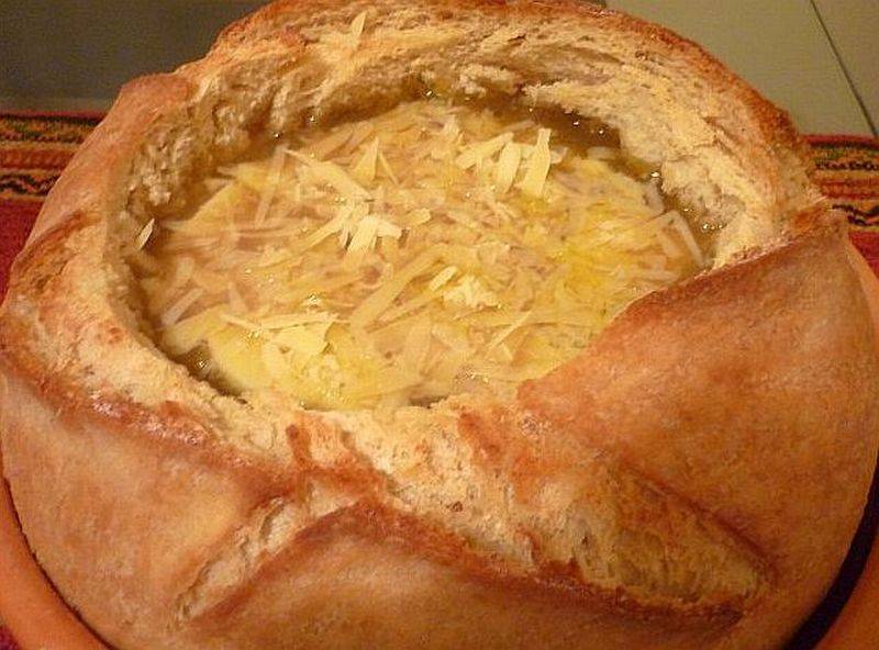 Quando o pão ficar pronto, sirva imediatamente colocando a sopa dentro do pão e acrescente o queijo. Hummmmmmmm… E não é que choveu mesmo!