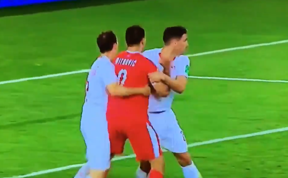 A falta em Mitrovic, entretanto, é ainda mais ostensiva. Como já dito, são dois jogadores da Suíça que agarram o avante e o levam ao chão como num golpe duplo de judô. Nenhum dos suíços tenta buscar a bola, estão apenas preocupados em barrar o oponente. Foi além do agarra-agarra considerado “normal”.