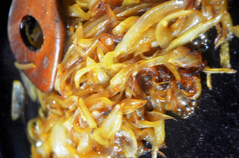 Em uma panela grossa, aqueça o azeite de oliva, junte a manteiga e refogue as cebolas até dourar. Adicione o açúcar depois de uns 10 minutos refogando para ajudar na caramelização.