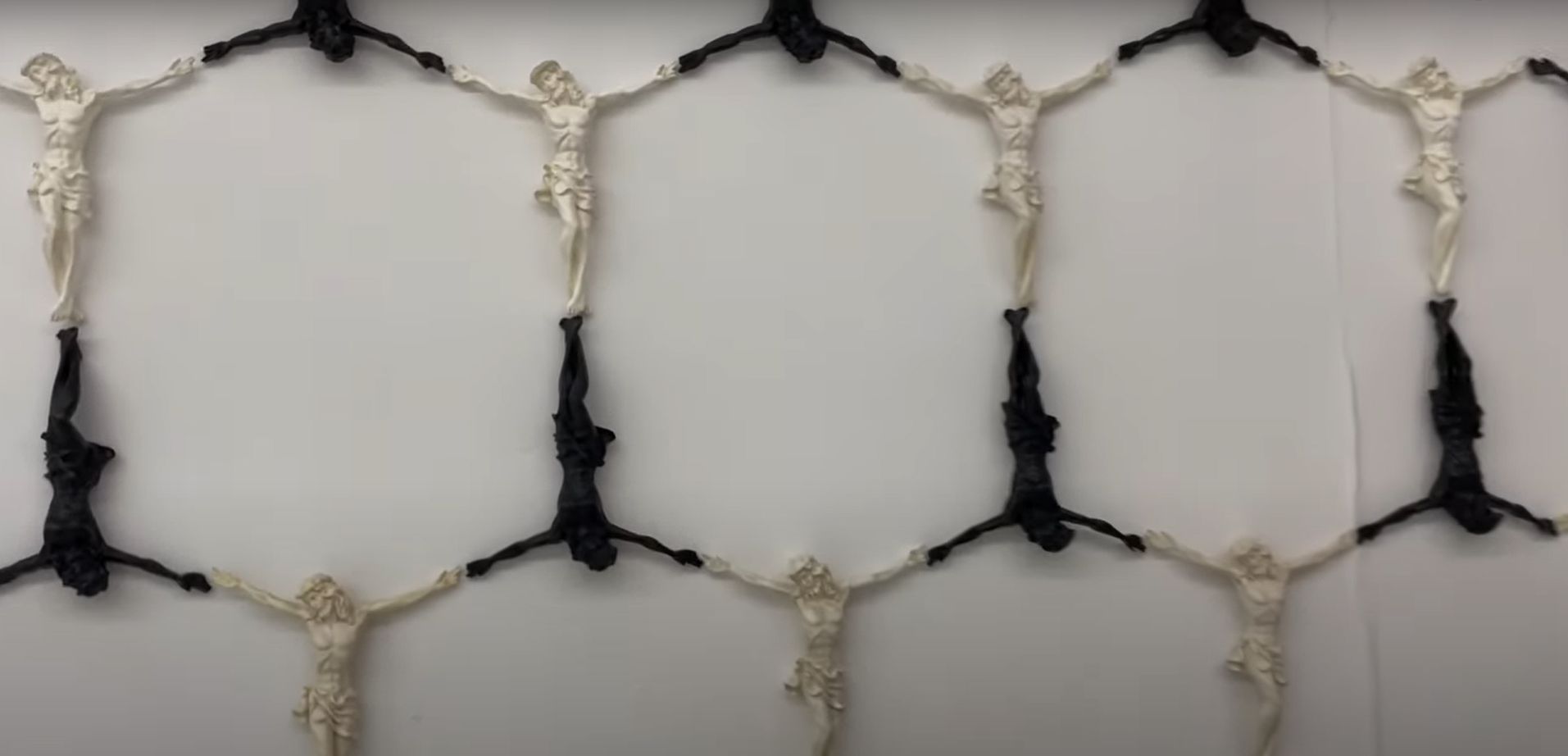 A exposição de arte utiliza-se de símbolos considerados sagrados para a fé cristã, tais como o crucifixo, de maneira jocosa e degradante, desrespeitosa à imagem e aos objetos considerados de natureza sacramental para a fé católica