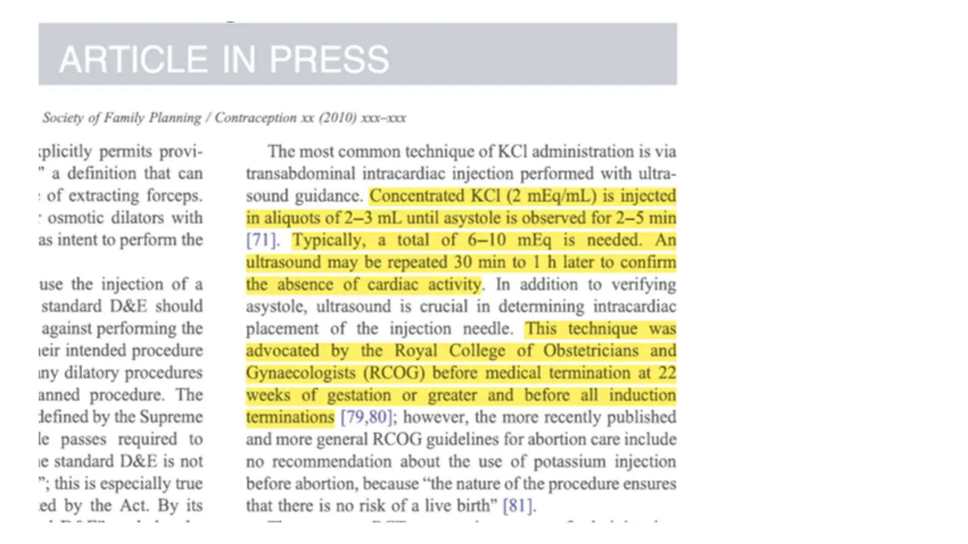 No protocolo “Society of Family Planning, Clinical Guidelines: Induction of fetal demise before abortion”, a posologia de KCl para matar os bebês é exposta em uma tabela que revela a concentração utilizada em vários estudos: